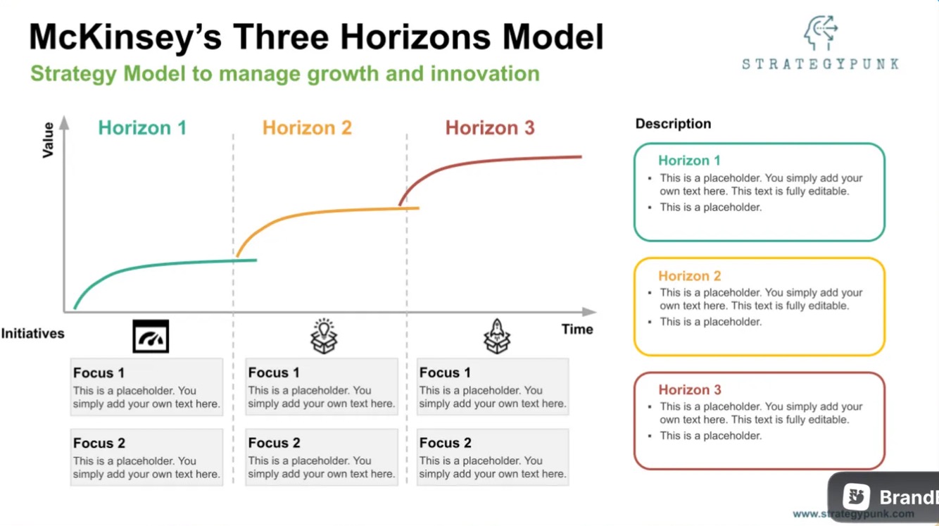 Zusammenfassend lässt sich sagen, dass das McKinsey 3 Horizon Model ein nützlicher Rahmen für Unternehmen ist, um ihre strategischen Prioritäten und Wachstumschancen zu managen, indem es die Aktivitäten in drei verschiedene Kategorien unterteilt: Aufrechterhaltung des Kerngeschäfts, Identifizierung und Entwicklung neuer Einnahmequellen und Erkundung neuer Möglichkeiten für Wachstum und Innovation. Es hilft den Führungskräften, sich auf die wichtigsten Bereiche zu konzentrieren und sicherzustellen, dass das Unternehmen alle potenziellen Wachstumschancen nutzt.